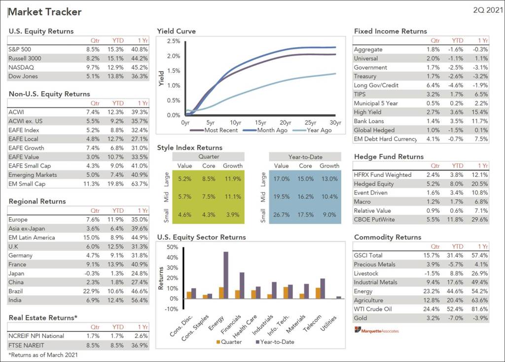 - Large-cap growth stocks outperformed value stocks in the second quarter, while value outperformed growth stocks year-to-date and in the small-cap company universe (see Market Tracker below).