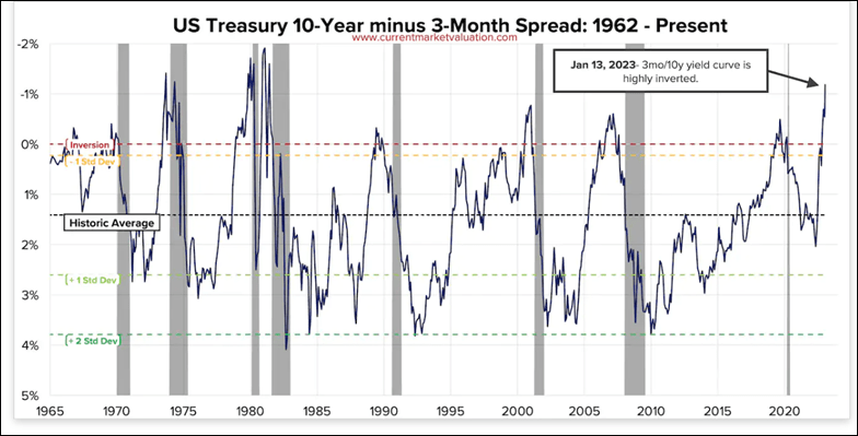 - With short-term interest rates exceeding long-term rates by a significant margin the inverted yield curve points toward a recession in 2023.