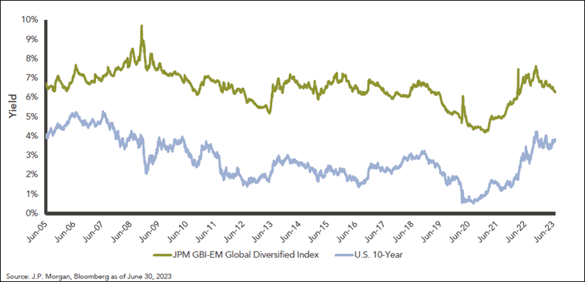 - Emerging markets are not immune to higher inflation, higher interest rates, and geo-political risks. But local emerging market debt looks attractive with higher yields relative to developed markets (see chart below), while many emerging market Central Banks are at or nearing the end of their tightening cycles, providing a possible tailwind for the asset class.