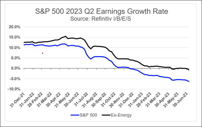 - 2023 Q2 Earnings Growth Rate is trending downward. The declining earnings growth rate trend from large-cap companies was negative when factoring in the energy sector and ex-energy companies.