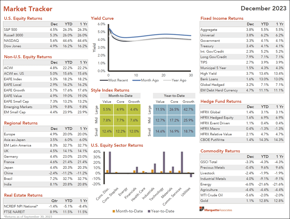 - During the fourth quarter the 10-year Treasury yields dropped almost 25% between late October and late December 2023 (from 4.98% to 3.78%, respectively) primarily because of subsiding inflation and dovish narrative from the Central Banks. This resulted in a bond market rally in the fourth quarter with the Bloomberg Aggregate Bond Index up 6.8% and bond markets ending the year with positive returns. (See Market Tracker below.)