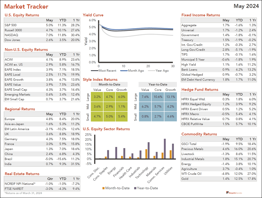 - A welcome rally in equities in all markets, except Brazil and Latin America, pushed some stock indices to all-time highs in May. The S&P 500 topped 5,400 for the first time and celebrated the 20-month anniversary of the bull-market as stock prices continued to rise during the period by more than 20%.
