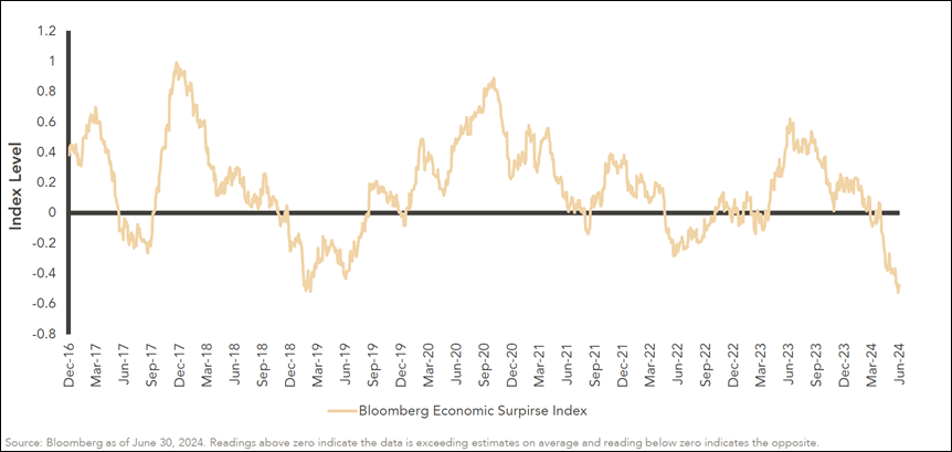 - Since the beginning of the year moderate economic growth continued. However, recent U.S. economic data have been below economists’ estimates to a degree not seen in several years. (See trend below including ISM manufacturing, services, and other data).
