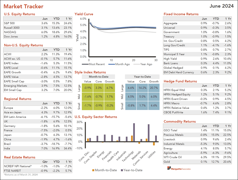 - The second quarter ended with continued positive momentum in large-cap US equities driven by technology and artificial intelligence advancements, although returns were less robust than the first quarter. Technology stocks, especially the “Magnificent Seven” companies, continued to outperform. (See Market Tracker below.)
